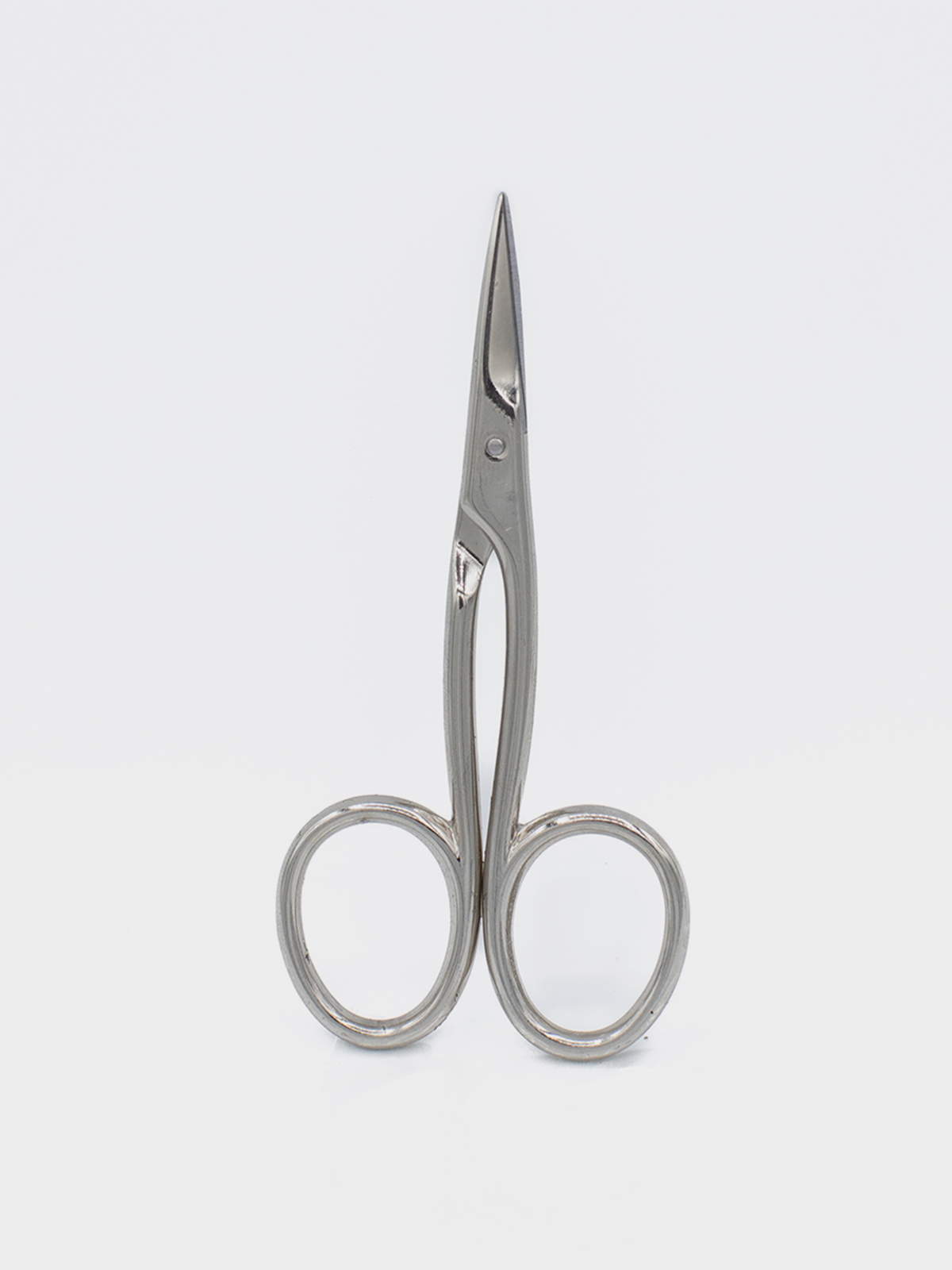 Scissors to cut thread. Carbon steel, nickel plated. Straight blades with a narrow and sharp tip.