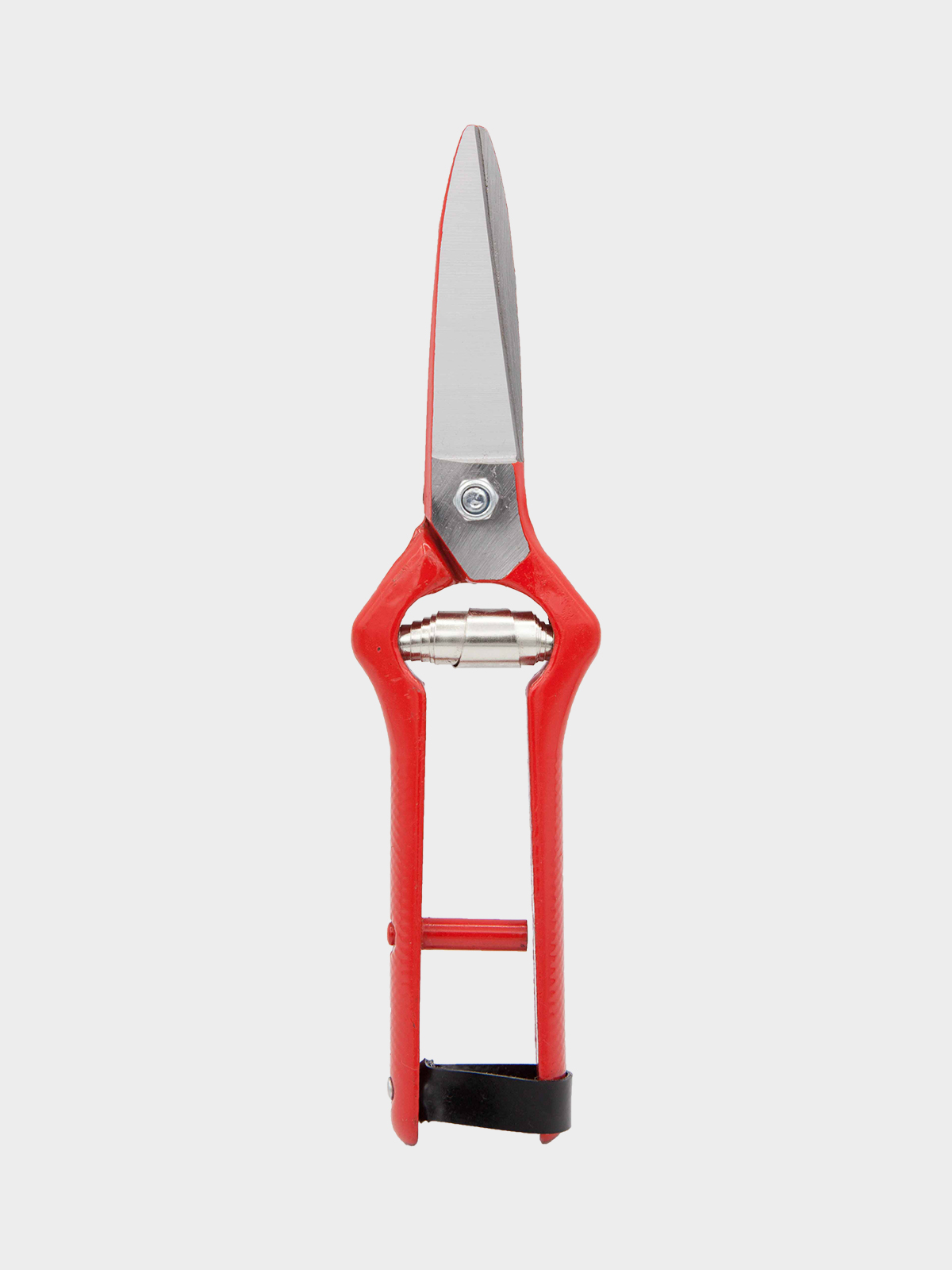 Tesoura em aço carbono forjado. Cabos com pintura electrostática de cor vermelha e lâminas retas e simétricas (uma delas serrilhada).