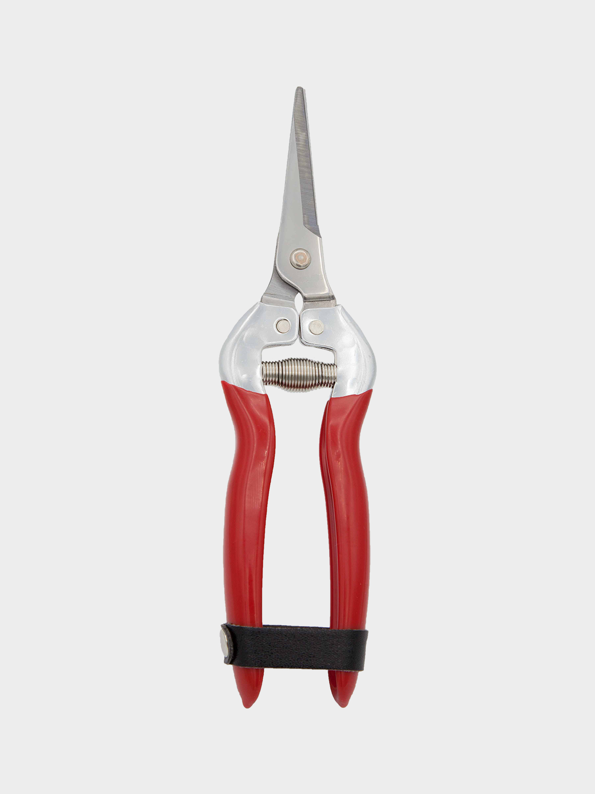 Tesoura totalmente produzida em aço inox, com lâminas retas estampadas e cabos revestidos a borracha.