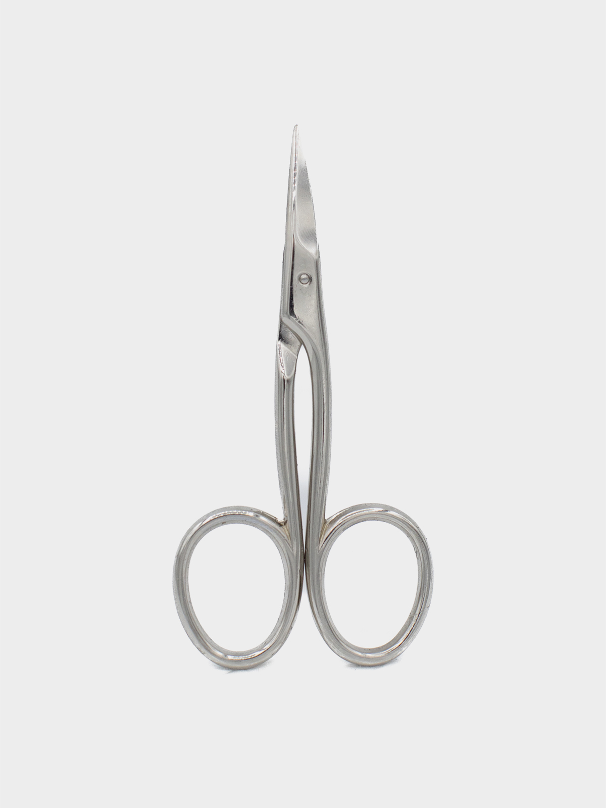 Tesoura para corte de linhas. Em aço carbono niquelado. Lâminas curvas, com ponta estreitas.